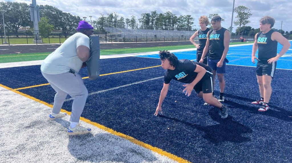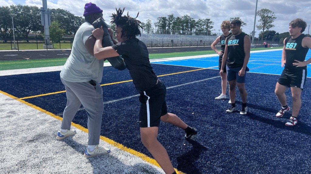 Micanor Regis (Belle Glade native/Pahokee alum; University of Miami alum; former NFL player; Wellington defensive coordinator/defensive line coach) coached up the defensive linemen in their positional drills. He helped get them ready for the DL vs. OL 1-on-1’s, as they all gained a level of confidence and experience in this showcase.