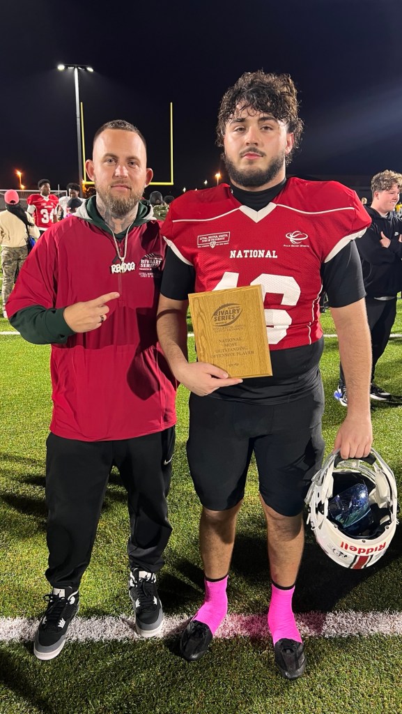 Case in point: In what was a low-scoring affair at the Palm Beach County All-Star Game last night (Dec. 14) at Jupiter High School, the 6-foot-2, 230-pound athlete from Palm Beach Central took full advantage of his body frame as a tight end. He hauled in a touchdown catch from senior quarterback Sean Siska (Delray Beach American Heritage) on a corner route late in the third quarter of National’s 10-7 win over American.